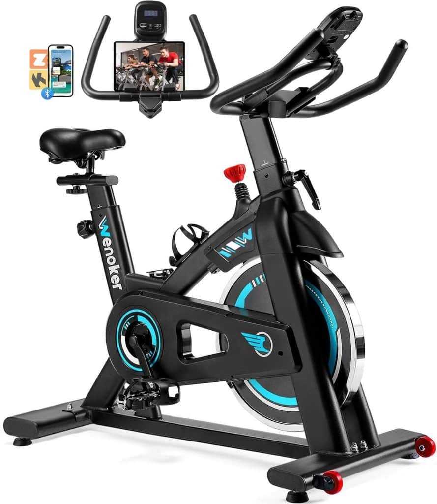 Wenoker Vélo D'appartement,Vélos D'appartement Connecté à une Application,Avec écran LCD, Résistance Réglable, Guidon Réglable et Siège Confortable, Capacité de Charge de 140 kg[Mise à Jour 2025 - Vélo D'appartement Intelligent Wenoker] : Le vélos d'appartement Wenoker amélioré est compatible avec les applications Kinomap et Zwift, permettant des entraînements, des courses et des défis virtuels. Il offre un suivi en temps réel plus précis des données d'entraînement, notamment la durée, la vitesse, la distance et la consommation de calories, permettant ainsi aux utilisateurs d'adapter leurs programmes d'entraînement à leurs progrès. [Un Vélo D'appartement plus Stable, plus Silencieux et plus Fluide] : Ce volant d'inertie amélioré, spécialement conçu pour les vélos d'appartement, assure un mouvement fluide et régulier. Équipé de poulies ABS, de roulements industriels et de freins à patins en feutre améliorés, le velo d appartement Wenoker élimine les problèmes de poulies cassées, de courroies desserrées, de restes de courroies desserrés ou de bruit excessif souvent associés aux anciens freins à patins en feutre. [Résistance Réglable, Arrêt Instantané] Le velo d'appartement Wenoker dispose de 100 niveaux de résistance réglables, vous permettant d'ajuster l'intensité en fonction de votre condition physique et de vos objectifs d'entraînement. Que vous soyez débutant ou cycliste expérimenté, vous trouverez le réglage de résistance adapté pour optimiser vos résultats. Un frein d'urgence arrête immédiatement le volant d'inertie pour plus de sécurité. [Vélo D'appartement au Design Sophistiqué] Ce velo appartement est doté d'un guidon avant antidérapant réglable en deux directions et d'une selle réglable en quatre directions, permettant un réglage en hauteur et en avant/arrière. Il convient aux personnes mesurant entre 1,40 et 1,85 mètre et supporte une charge maximale de 140 kg. Le coussin d'assise hautement élastique et souple assure une conduite confortable, tandis que les pédales en alliage d'aluminium, équipées de sangles réglables et d'écrous de fixation, empêchent la casse et le glissement. [Vélo D'appartement à Montage Rapide]: Entièrement pré-assemblé et accompagné d'une notice détaillée, ce velo d appartement installe en moins de 30 minutes. Des tutoriels vidéo professionnels et un service client sont disponibles, et une garantie d'un an vous garantit un achat sans souci. Wenoker est spécialisé dans les équipements de fitness à domicile et se soucie de votre santé !219,99 €145,80 €-34%